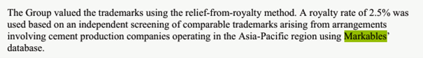 Within the purchase price allocation, DMCI retained an external valuation specialist to value CHP’s trademarks. The valuation specialist determined a royalty rate of 2.5% for cement production companies, based on comparable data from MARKABLES. The resulting trademark value accounted for approximately 10% of CHP’s enterprise value.